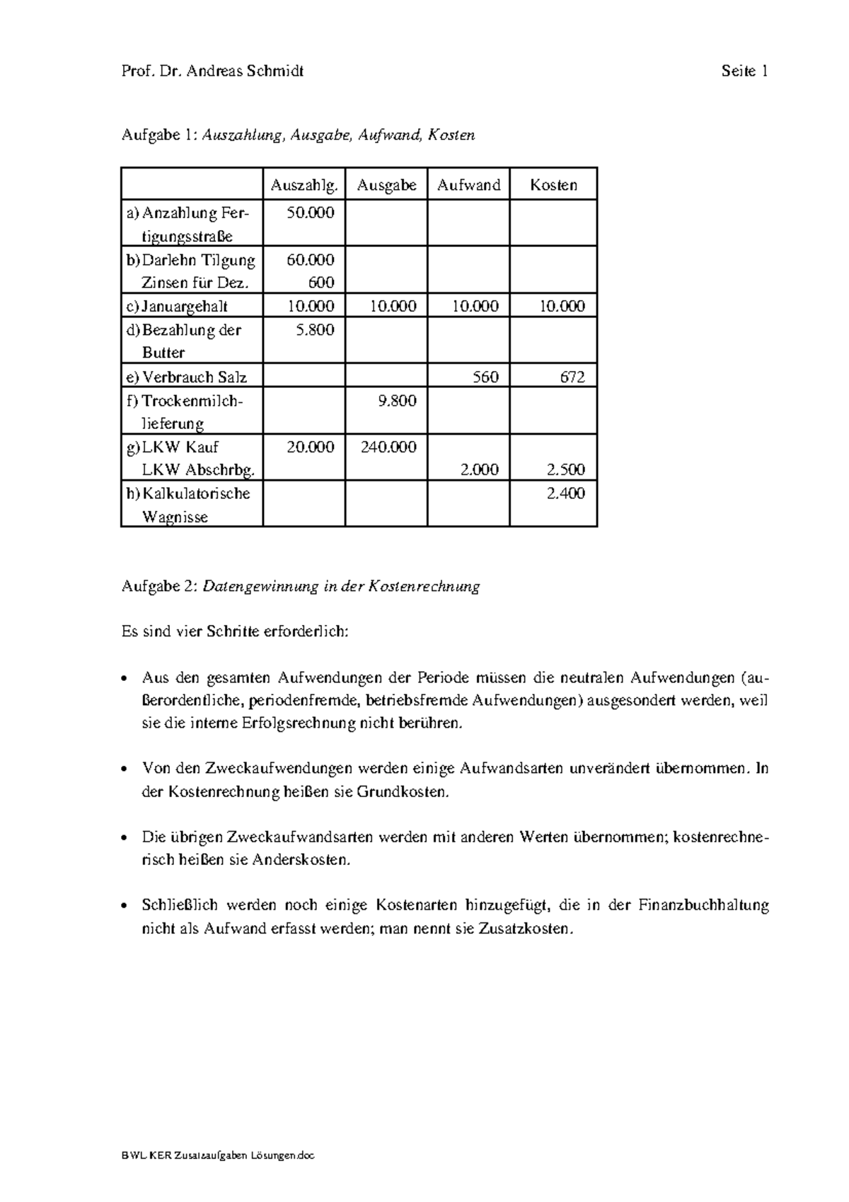 BWL KER Zusatzaufgaben Lösungen Aufgabe 1Auszahlung, Ausgabe, Aufwand, Kosten Auszahlg