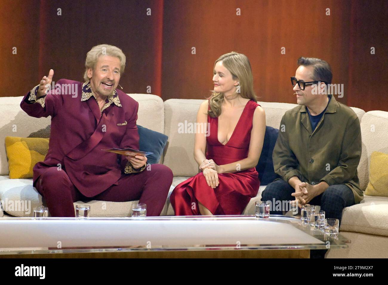 OFFENBURG, GERMANY - NOVEMBER 25: Thomas Gottschalk, Stefanie Stappenbeck and Jan Josef Liefers speak on stage during the „Wetten, Dass.?" tv show on November 25, 2023 in Offenburg, Germany.