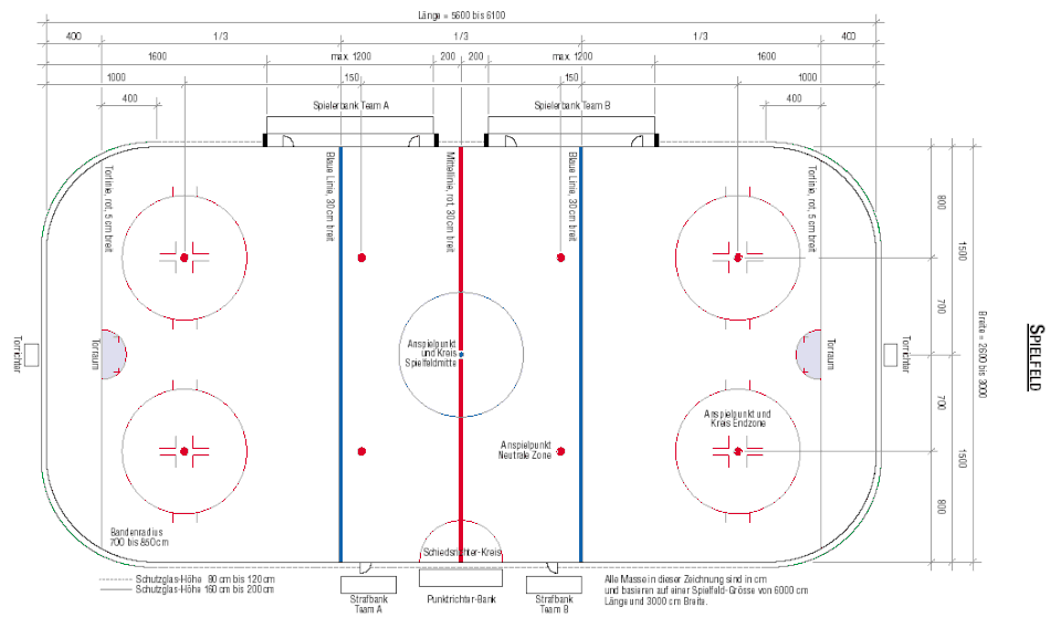 Das Spielfeld im Eishockey weist einige unterschiedlich farbige Linien, Flächen und Zonen auf. Fangen wir ganz außen an. Die Größe des gesamten Spielfeldes liegt zwischen der maximalen Abmessung von 30 x 61 m und der minimalen Abmessung von 26 x 56 m. Die Spielfeld-Ecken sind dabei abgerundet, wobei der Radius dieser zwischen 7 und 8,5 m liegt.